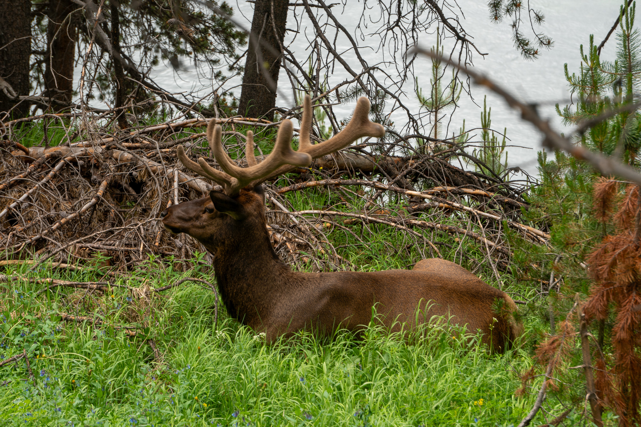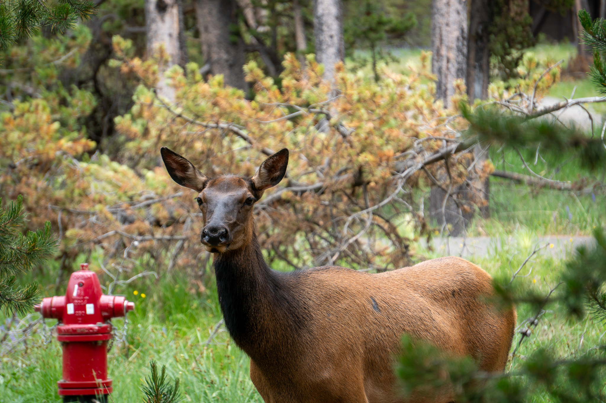 Over three days, we saw more black bears at varying distances, multiple elk (including one with fuzzy antlers that was honestly the cutest thing we’ve ever photographed), and bison everywhere. Big, majestic, completely unbothered by the holiday crowds. On our way out via the east exit, we spotted a mama moose and her baby from a distance.