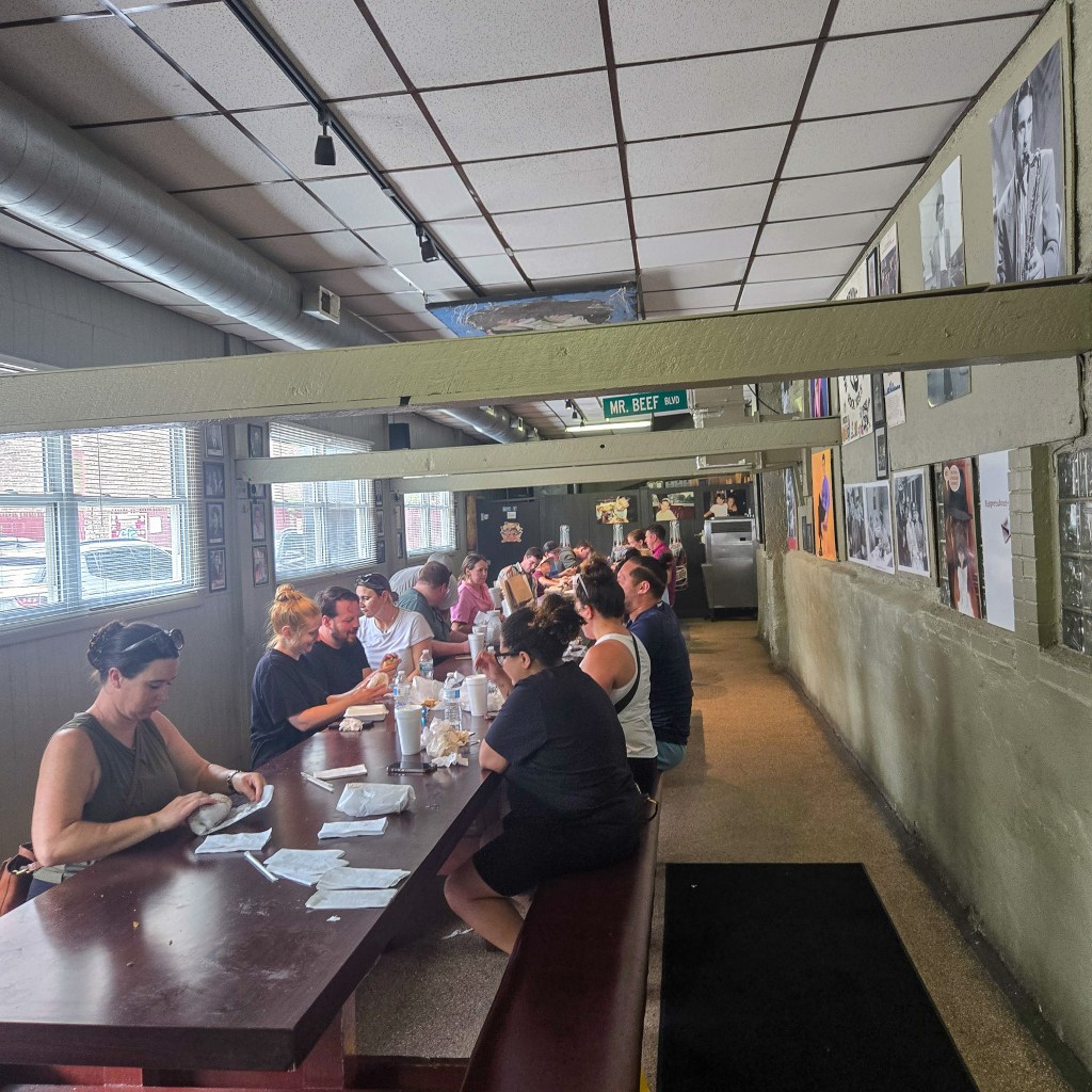 Saturday morning, Ethan and I snuck away from the group for a lunch that became my absolute favorite moment of the whole trip. We went to a place called The Beef for Italian beef sandwiches, and honestly, I could not have been more excited. The second we walked in, it felt exactly like the first episode of The Bear. This is the actual restaurant that inspired the show, and being there felt surreal. The energy, the setup, the whole vibe. I’m pretty sure I had the biggest smile on my face the entire time. We beat the lunch rush and got our sandwiches around 11am, which was perfect timing because by the time we left, the line was absolutely absurd.