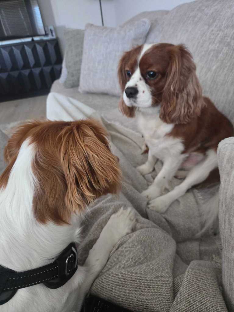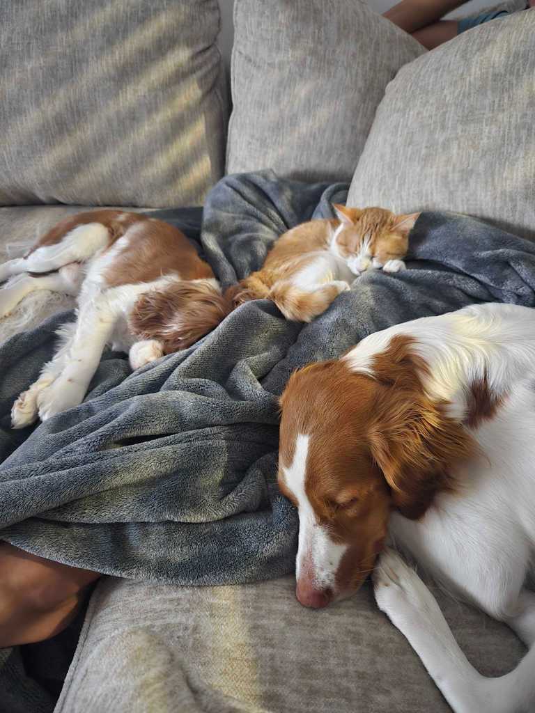 We were caring for Texas, a cocker spaniel who was orange and white and looked so much like Rooster that it was almost funny. He was an incredibly good boy. Then there were Tilly and Mila, two cats who were honestly some of the best cuddly cats we have ever met. Rooster was completely obsessed with all of them. Texas and Rooster had a whole buddy situation going, and Rooster spent most of his time trying to get Tilly and Mila to love him as much as he loved them. They were polite about it. Mostly.