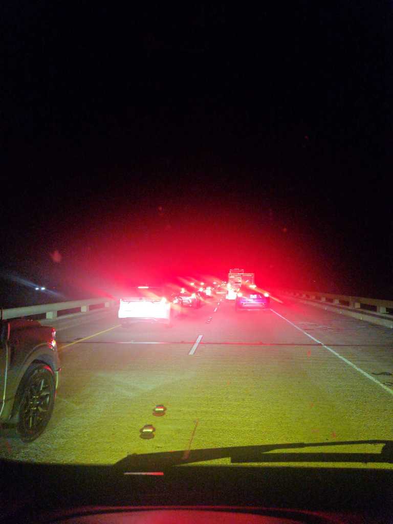 We ran straight into brutal traffic outside New Orleans, the kind that stops completely and doesn’t move. A three car crash ahead of us had everything locked up, and we happened to be sitting on a bridge when it happened. If you have never been stuck on a bridge in a van at night while emergency vehicles need to get through, consider yourself lucky. It is not a fun situation. The lanes are tight, there is nowhere to go, and we had to maneuver multiple times to make room for vehicles coming through. Not scary exactly, just stressful and slow and the kind of thing that tests your patience after an already long day.