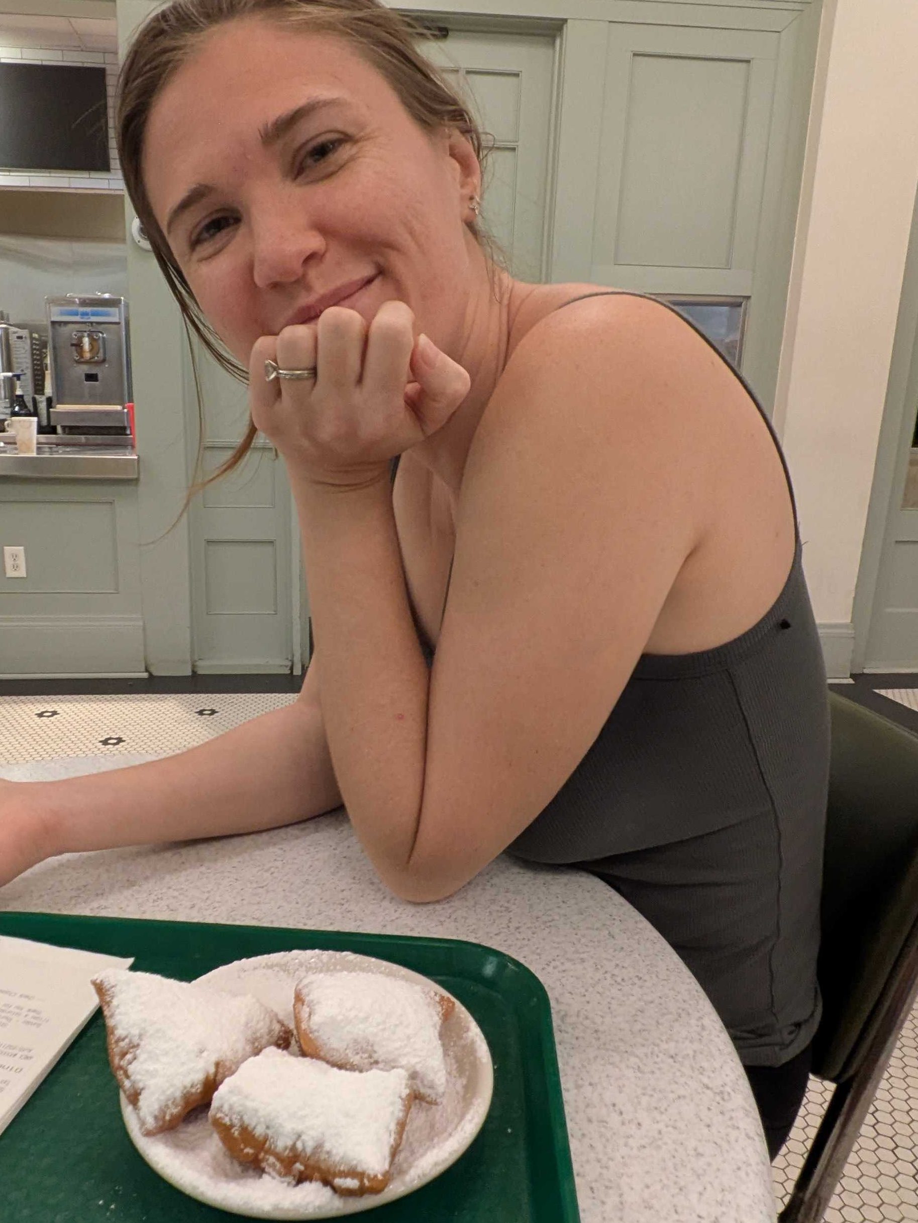 We sat down, ordered, and just enjoyed a quiet little date night. Fresh, warm beignets covered in powdered sugar after a full day of driving. It was exactly the kind of simple sweet moment that makes a long travel day worth it. No agenda, no sightseeing, just the two of us and a pile of beignets.