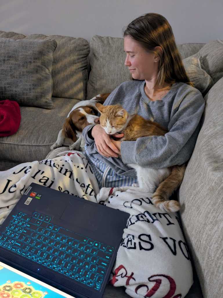 The house itself was wonderful. A comfortable living room and couch that fit the whole crew for evening snuggle sessions, nice walking paths nearby for daily walks with the dogs, and a solid setup for getting work done. After days of coffee shop hopping and Cracker Barrel parking lots, having a real couch and a real kitchen felt like a luxury.