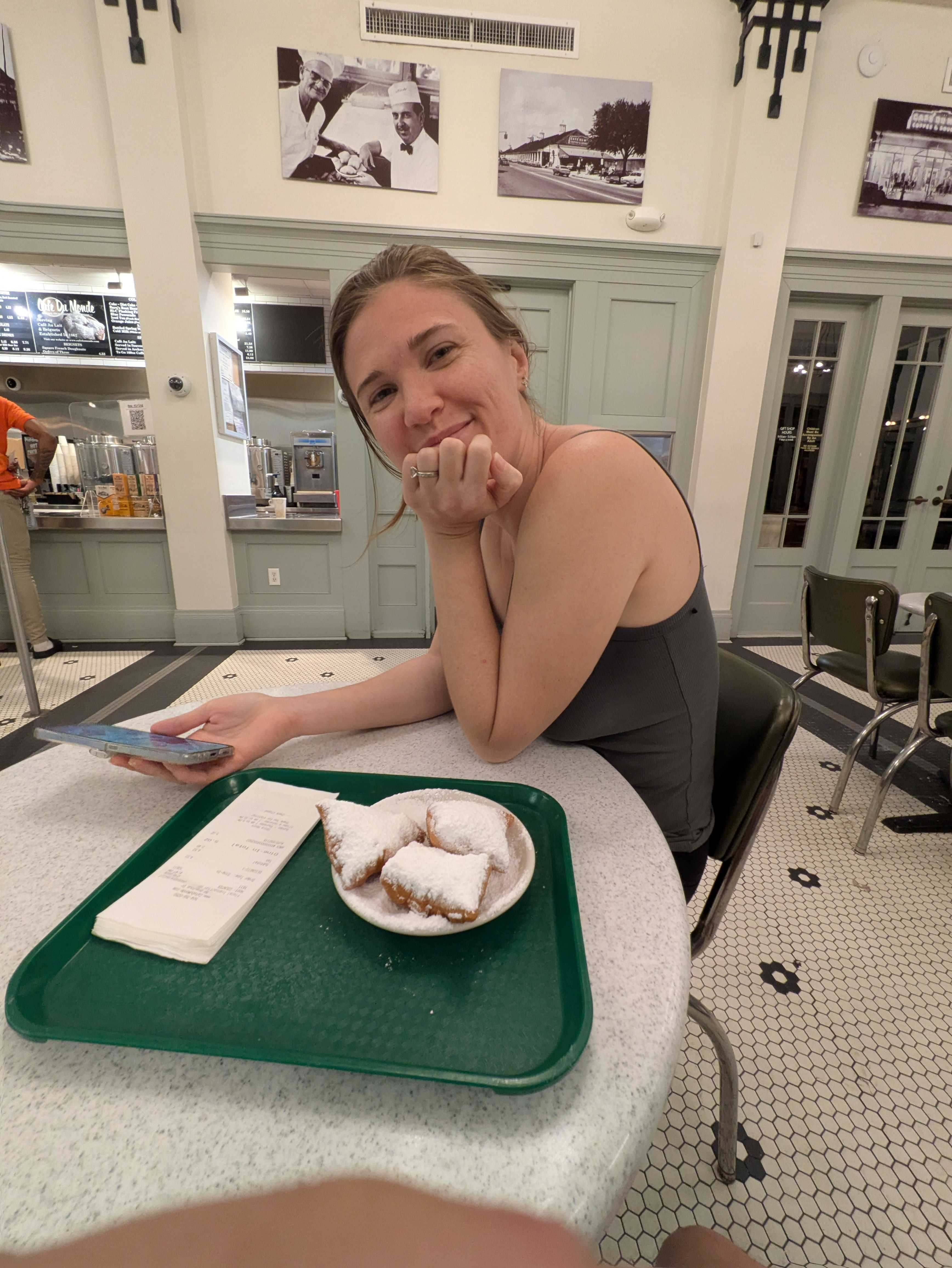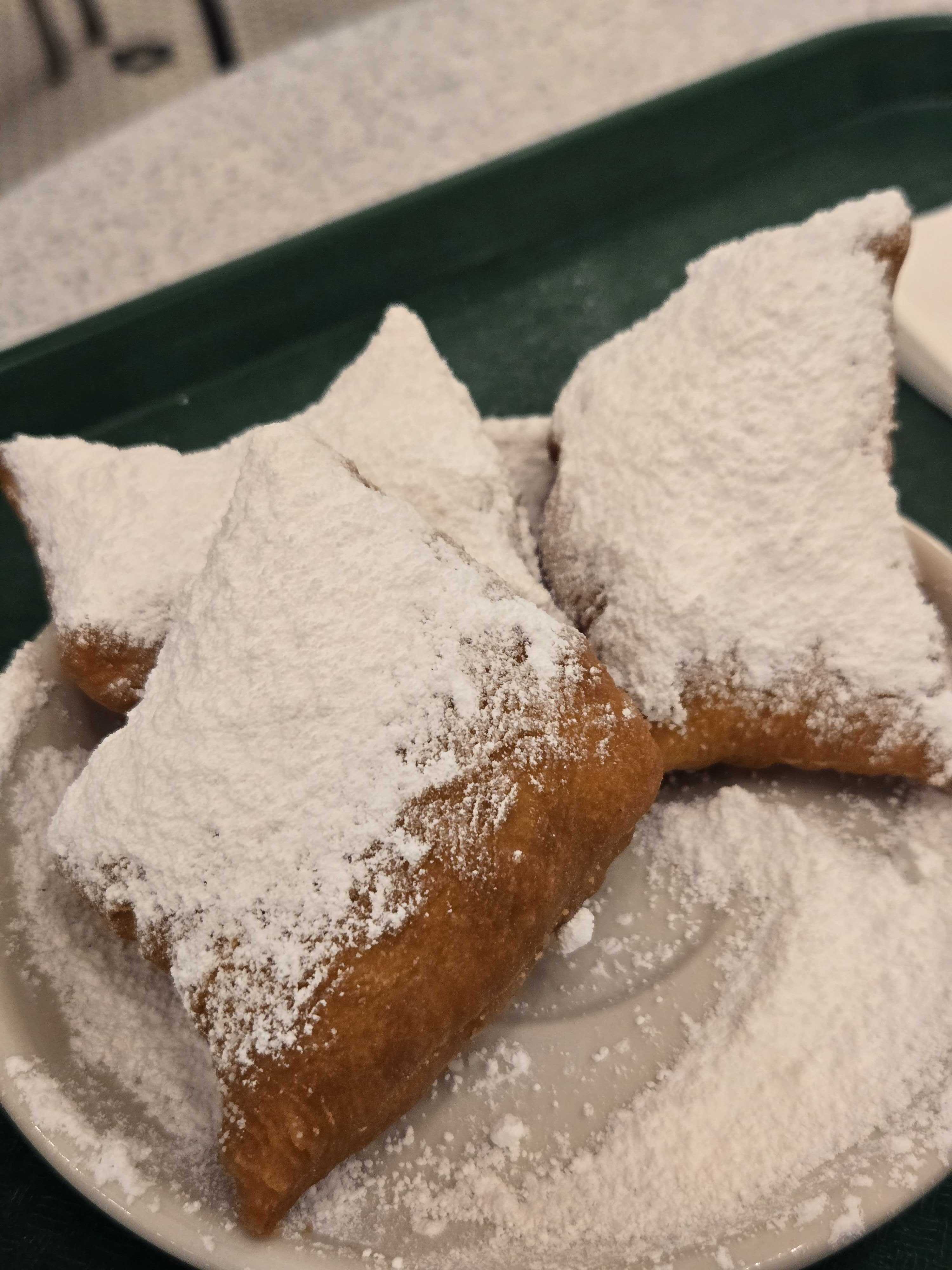 We sat down, ordered, and just enjoyed a quiet little date night. Fresh, warm beignets covered in powdered sugar after a full day of driving. It was exactly the kind of simple sweet moment that makes a long travel day worth it. No agenda, no sightseeing, just the two of us and a pile of beignets.